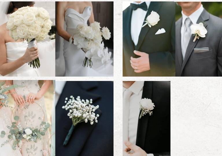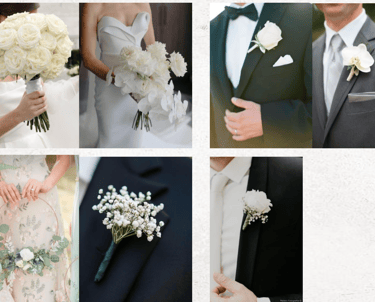 Note : 2 bouquets of bride, 2 corsage of groom, 2 bridesmaids' bouquets, 2 groomsmen corsage, 2 family corsage