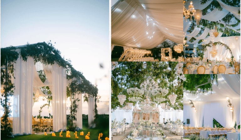 We called it roder tent, and its not only for preventing the rain but also it becomes one of the most favorite wedding concept nowadays.. Because that big size tent is giving a statement to the decorations in making it look more luxury, grand, and making the area of the decorations looks fuller and stunning. We can play around with drapes, hanging greeneries, chandelier, flowers, etc.